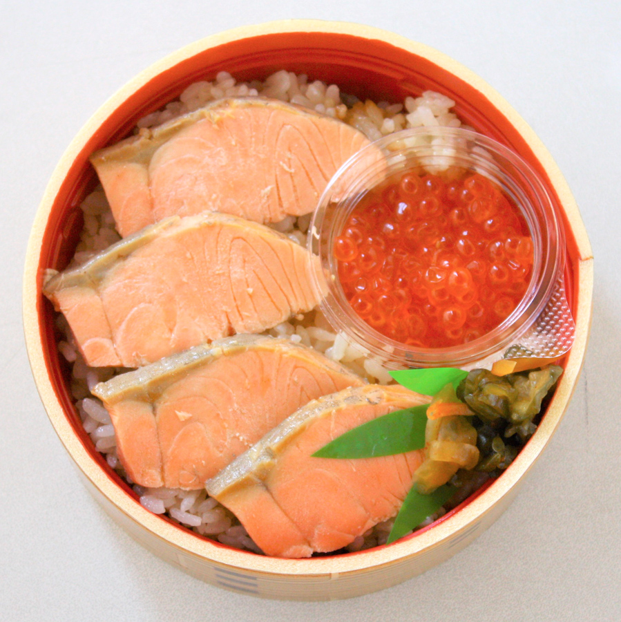 鮭の煮汁で炊いたご飯、宮城県産銀鮭煮、マスいくらしょうゆ漬け(別添)、萬来漬(胡瓜、大根、人参、しその実)